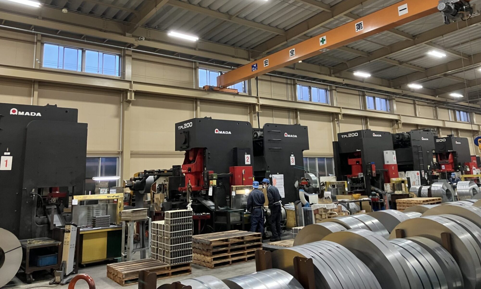 順送プレス加工部門では、自動送り装置(レベラーフィーダ)と連動し鉄のコイル材を連続的に送り込み、穴あけ・曲げ・切断などの複数工程を一台で行うことが出来ます。高精度かつ高効率な大量生産の製造を実現しています。
